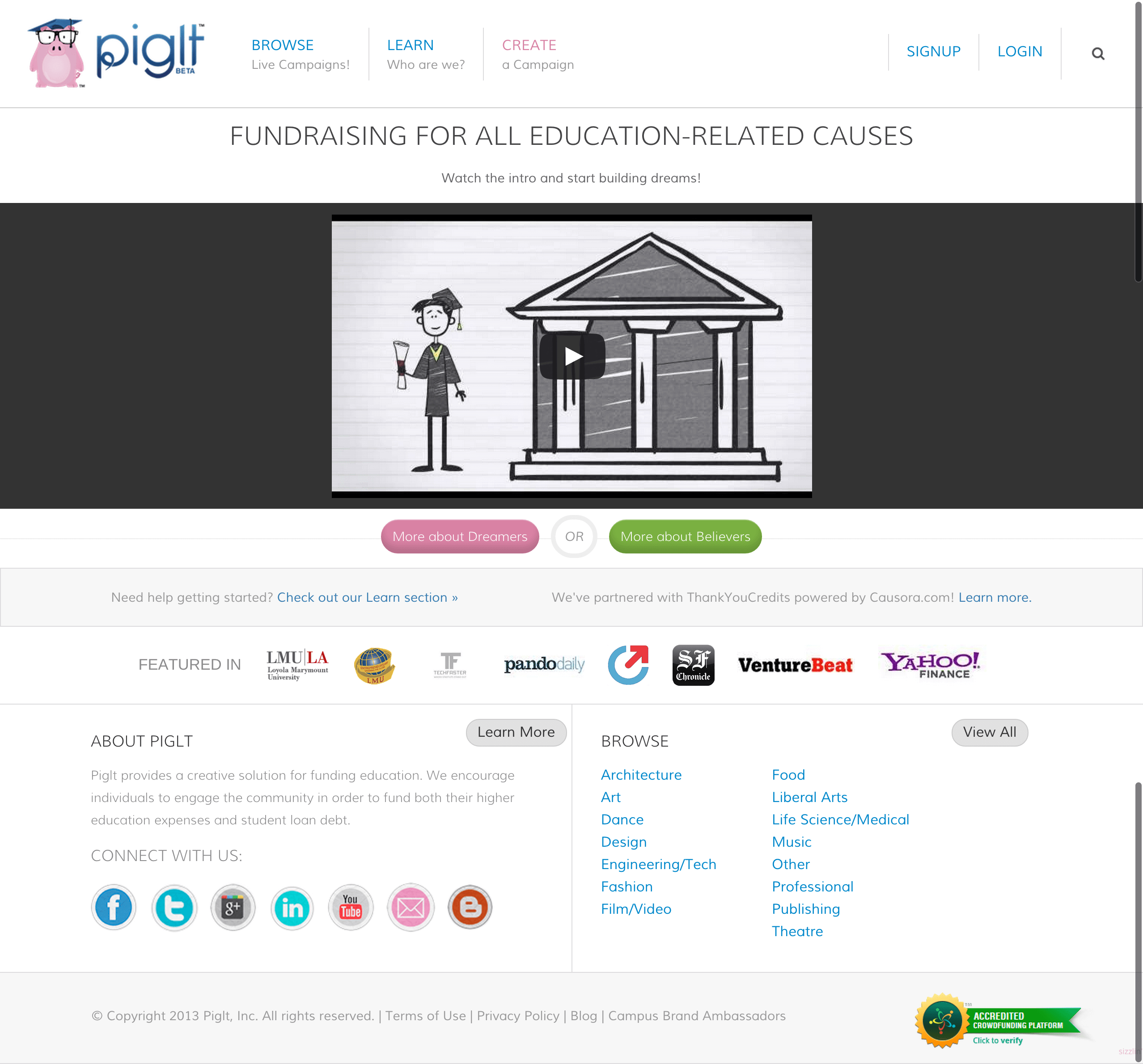 Piglt is one of our very first clients. It was a great experience working for a good cause. Piglt provides a creative solution for funding education. Piglt encourage individuals to engage the community in order to fund both their higher education expenses and student loan debt.